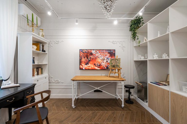 Но главным пожеланием художницы было наполнить комнату светом. Выполнить его авторам проекта помогли накладные потолочные светильники 4005 и трековые светильники 4116. Они создают направленный свет, то есть выделяют определенную область, разбивают пространство на зоны.