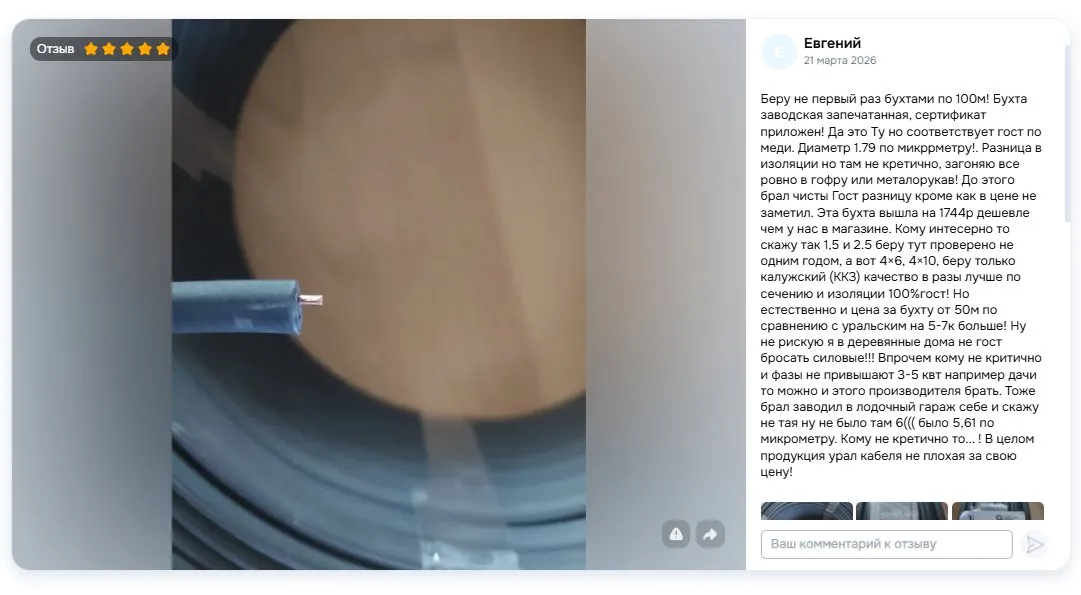 Сечение «хорошее за свои деньги». Потребитель явно имеет понимание соотношения «цена-качество» и работал с разной кабельной продукцией.